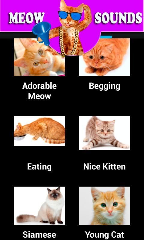 Beberapa Cat Sounds termasuk suara Talking Cat, Cat Marah, Hungry Cat, Cat mendengkur, Cat Meow, Kucing Mad, Lucu Cat, Happy Cat, Cat Konyol, Dua Kucing berkelahi, Cat Roar, Kitten Suara, Frustrasi Cat Meow, Kucing berteriak, Kucing Memohon tuannya, Cat Mendesis, Kucing Meminta pangan, Kucing di Fighting, Aging Cat suara, Adorable Meow dari kucing, Cat Mengemis untuk memberikan yang Cat food, Cat makan makanan kucing, A Nice Kitten Sound, Cat Siam Breed Suara Young tumbuh Cat Sound, Cat House Suara, Kucing makan, Cat Persia dan banyak lagi.