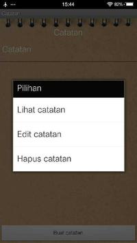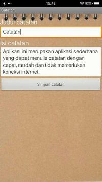 Catatan sederhana sebagai notebook pribadi dan tanpa menggunakan koneksi internet. Fitur-fitur: Buat catatan Judul catatan Isi catatan Simpan catatan Lihat catatan Edit Catatan Hapus catatan