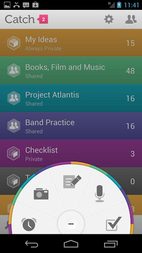Catch: notepad, checklists, voice memos, reminders and moreCatch Notes is a free note taking app designed to make sure you never miss an idea. It lets you capture ideas and discoveries across all your devices and when you39;re ready, turn your ideas into action with friends and colleagues using simple, mobile collaboration.NEVER MISS AN IDEA NEW Capture ideas instantly with the Catch capture wheel. Create voice, photo and text notes, online AND offline NEW Track private tasks with checklists and... NEW Share checklists to collaborate on todo lists Set reminders so you never miss something important Use email to send web content to notes@catch.com FIND AND SAVE ALL YOUR DISCOVERIES Collect ideas into personal spaces as they develop Use tags to label and find your notes easily Automatically backup notes for free across all of your mobile devices and on the web Protect your notes with a 4digit PINTAKE ACTION WITH LIGHTWEIGHT MOBILE COLLABORATION Create shared spaces for secure, selective collaboration between friends and colleagues Use Catch to collaborate with checklists, notes and documents Everything you create together is automatically backed up securely across everyone39;s mobile devices and at Catch.com LEARN MORECatch blog: https:catch.comblogFacebook: http:facebook.comcatchTwitter: http:twitter.comcatchYouTube: http:youtube.comcatch Upgrade to Catch Pro to attach PDFOffice files, to create up to 50 spaces and upload up to 1GB of new content each month or to Catch Premier for up to 200 spaces and 5GB of new monthly content. Recommended by: Time Tech: quot;25 of the best and free Android apps to get you startedquot;, TechCrunch: quot;10 Apps All New Android Users Should Check Outquot;, OReilly Media: quot;Best Android Apps, The Guide for Discriminating Downloaders, PCWorld: quot;10 Hot Honeycomb Apps for Businessquot; and Datamation: quot;50 MustHave Android Appsquot;. Note that the Read contact data permission is there only so you can easily pick email addresses from your existing Contacts list when inviting people to share your spaces. For more information, please read https:catch.comblog201209whydoweaskforpermissions