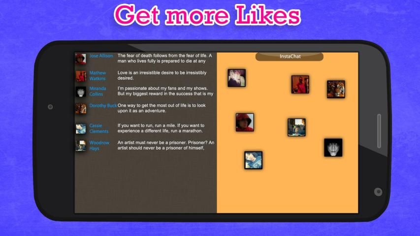 Gunakan Obrolan Teman untuk Instagram untuk menemukan lebih banyak pengikut, dan teman-teman. Jika Anda ingin menjadi cepat populer, dan menemukan orang-orang baru, kemudian gunakan aplikasi ini untuk mendapatkan pengikut yang layak Anda dapatkan. Bila Anda menggunakan Obrolan Teman Anda bisa aktif memilih siapa Anda ingin mengikuti Anda dengan membuat berteman dengan mereka. Obrolan Teman tidak seperti yang lain aplikasi Instagram follower. Anda tidak perlu mengikuti siapa pun bagi mereka untuk mengikuti Anda kembali. Anda mengontrol siapa Anda ingin berteman dengan. Setelah Anda tertarik untuk menjadi teman, Anda dapat bertukar nama pengguna Anda, pesan satu sama lain kemudian, dan mengikuti satu sama lain di Instagram. Jika Anda tidak menyukai seseorang yang Anda dapat melaporkannya, atau hanya memblokir mereka dari pesan Anda. Chatting Teman untuk Instagram tidak berafiliasi atau disponsori oleh Instagram.