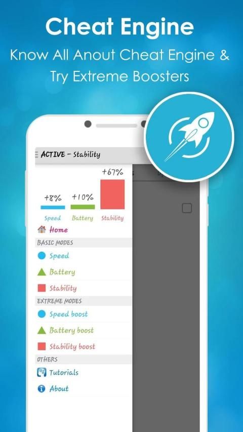 Cheat Engine is professional, easy to use booster app which gives your android phone a longer life with optimum speed, improved battery life, lagging free stable smartphone experience. Cheat is a complete all-in-one app which ensure to maximize your android device's performance. You don't need different apps to boost speed or to save battery or to improve condition of your device. Cheat Engine do it all for you with just single tap.