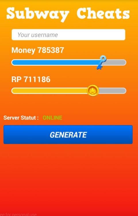 Gunakan alat hack kami untuk peselancar kereta bawah tanah menipu koin dan kunci untuk prank peselancar kereta bawah tanah pemain dan membuat mereka percaya bahwa kunci dan koin bebas untuk menghasilkan menggunakan cheats subway surfer alat kami dan bersenang-senang dengan mereka.