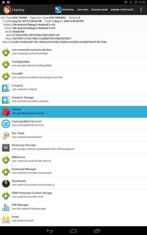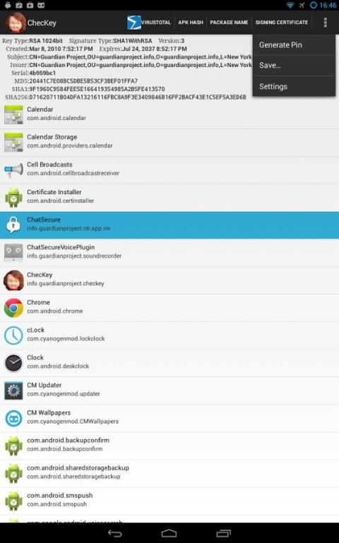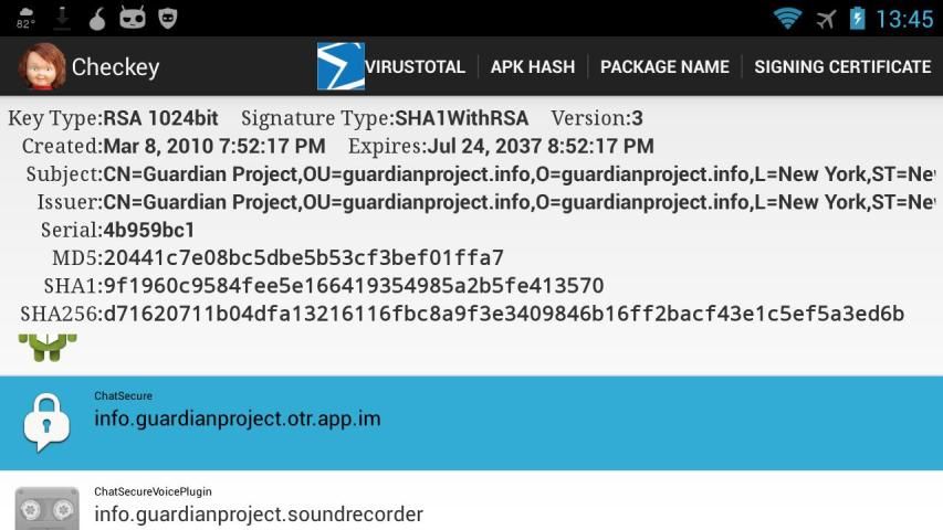 Checkey adalah utilitas untuk mendapatkan informasi tentang APK yang diinstal pada perangkat Anda. Dimulai dengan daftar semua aplikasi yang telah terinstal pada perangkat Anda, ia akan menampilkan tanda tangan APK dengan satu sentuhan, dan menyediakan link ke virustotal.com dan androidobservatory.org untuk dengan mudah mengakses profil APK itu. Ini juga akan memungkinkan Anda mengekspor sertifikat penandatanganan dan menghasilkan ApkSignaturePin file pin untuk digunakan dengan perpustakaan TrustedIntents.