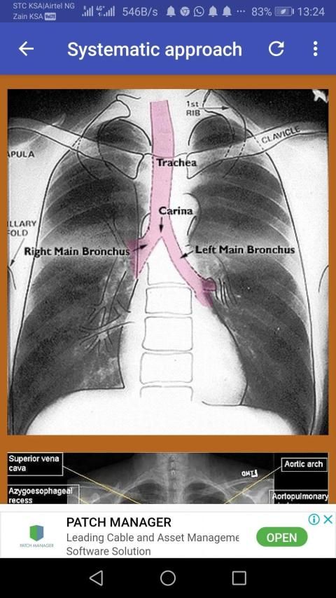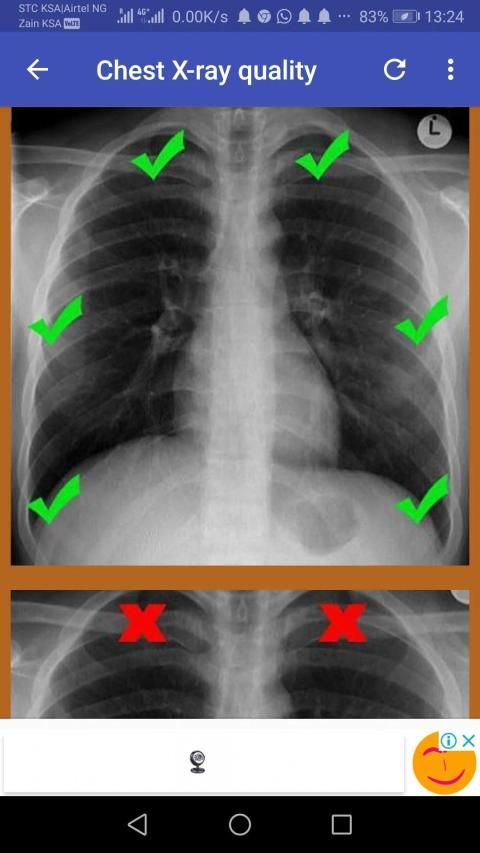 aplikasi ini menjelaskan bagaimana mengenali tanda-tanda radiologis dasar, patologi dan pola yang terkait dengan kondisi medis umum seperti yang terlihat pada foto polos dada, lateral dan AP.
