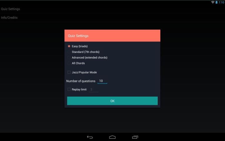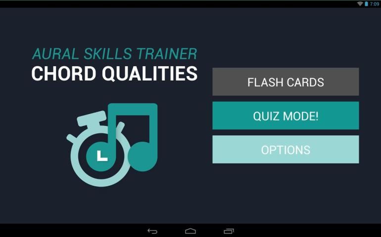 • Quiz Modus menguji pengetahuan Anda tentang akord dalam format pilihan ganda. Setelah berlatih dengan flashcards, memilih tingkat kesulitan (melalui menu Options, lihat di bawah) untuk menentukan seberapa baik Anda dapat mendengar setiap kualitas chord. Tingkat default adalah tingkat paling mudah, yang meliputi besar, kecil, ditambah dan dikurangi triad; tingkat menengah menambahkan akord 7; tingkat lanjutan meliputi akord 7 diubah dan tambahan akord diperpanjang-malaria (9ths, 11ths, dan 13ths); dan akhirnya, Jazz / Populer modus meliputi akord unik untuk mereka genre. Anda juga dapat memilih "Semua Chords" untuk mendapatkan ditanyai pada semua akord yang tersedia.