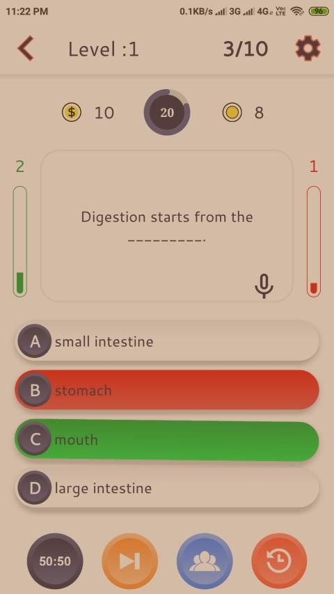 In every subject there are quiz levels. In each levels there are 10 questions. While playing quiz, questions will be displayed with four options. Select the option which you think is the correct answer. If your answer is correct the option you selected will be highlighted with green colour. If it is wrong then it will be highlighted with red colour and correct answer will be highlighted with green colour.