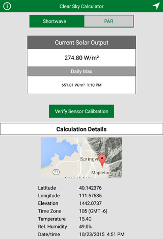 Clear Sky Calculator digunakan untuk menentukan perlunya kalibrasi ulang sensor radiasi. Ini paling akurat ketika digunakan di dekat Solar Noon di bulan-bulan musim panas. Kalkulator memperkirakan intensitas radiasi matahari (baik total radiasi gelombang pendek global, diukur dengan piraman, atau kepadatan fluks foton fotografis global, diukur dengan insiden sensor kuantum) pada permukaan horizontal kapan saja, di lokasi mana pun di dunia. Persamaan yang digunakan untuk memperkirakan radiasi langit langit yang jelas dengan Clear Sky Calculator berasal dari Hapus Sky Solar Model radiasi yang digunakan untuk menghitung radiasi bersih dalam Persamaan Evapotranspiration Referensi Asce Standar (http://www.kimberly.uidaho.edu/water/asceewri " /index.html). Satu-satunya persyaratan input untuk kalkulator adalah ketinggian situs, lintang, bujur, bujur referensi, dan suhu udara dan pengukuran kelembaban relatif. Data-data ini biasanya mudah diperoleh, membuat Clear Sky Calculator Referensi radiasi surya sederhana yang dapat digunakan untuk memperkirakan keakuratan pirarometer dan kuantum sensor dan menentukan perlunya kalibrasi ulang.