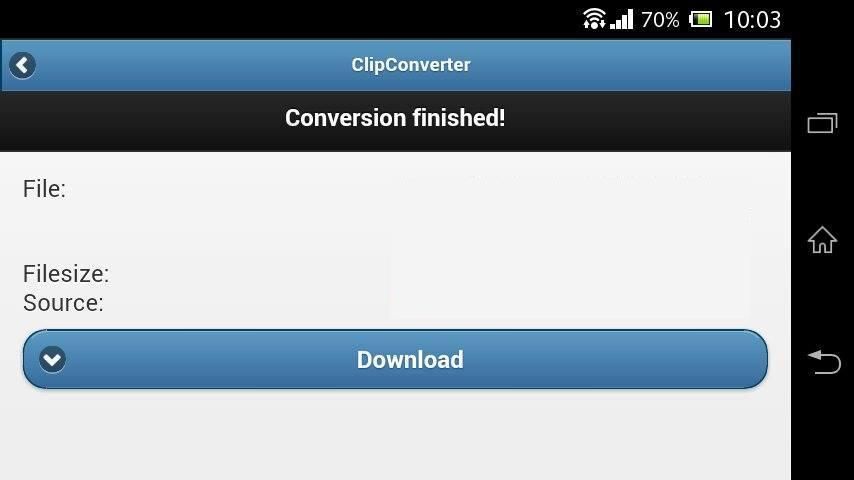 Yang sederhana seperti memilih video atau audio untuk mengkonversi, dan dengan menekan sebuah tombol Converter Klip melakukan tugasnya dalam hitungan detik. Ideal untuk menikmati musik favorit Anda dan video di smartphone Anda dan benar-benar gratis.