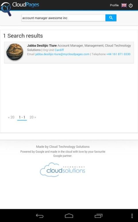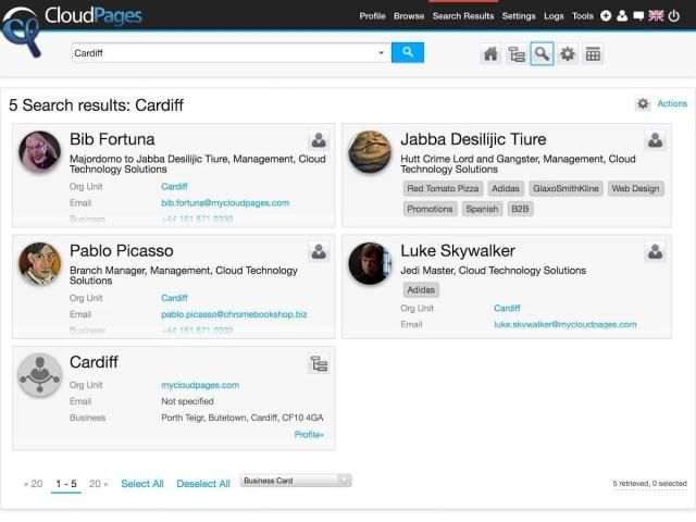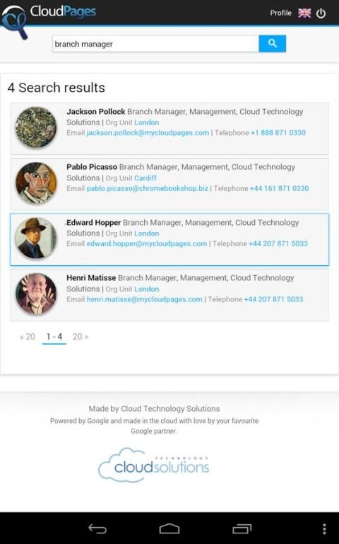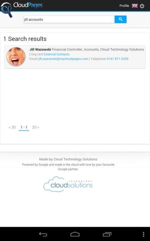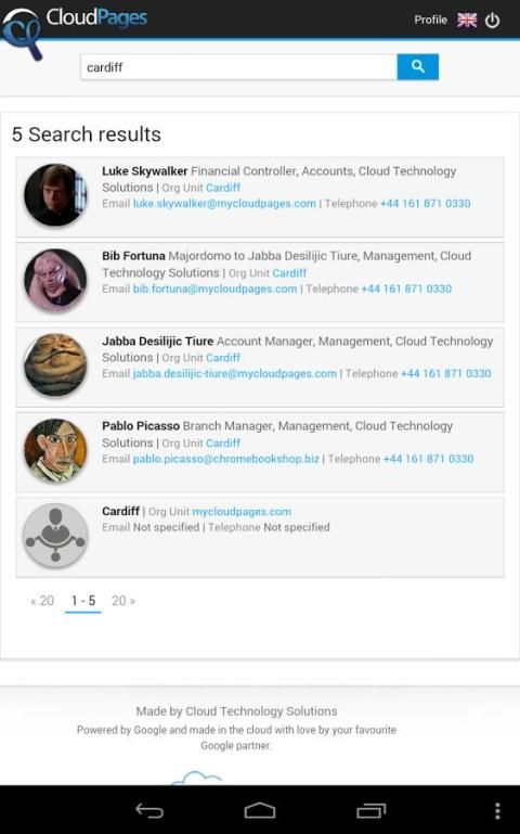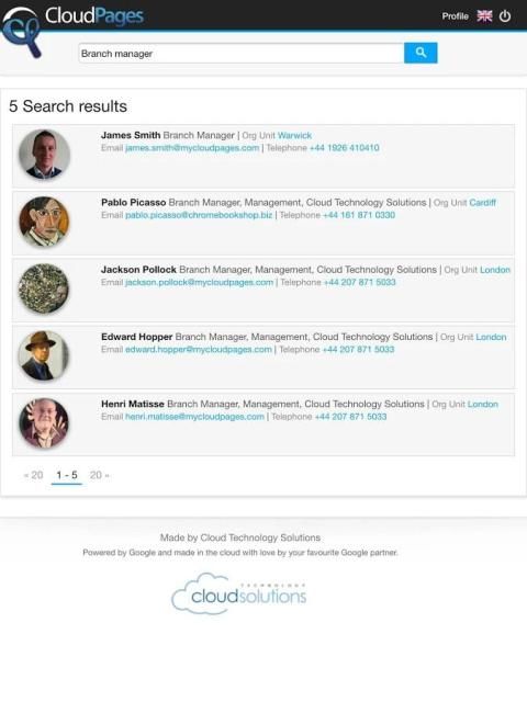 Dengan CloudPages baru aplikasi mobile Anda dapat mencari seluruh CloudPages Anda untuk Google Apps struktur organisasi dari ponsel Anda dan kemudian cukup tekan dengan aplikasi untuk menghubungkan melalui telepon atau email.