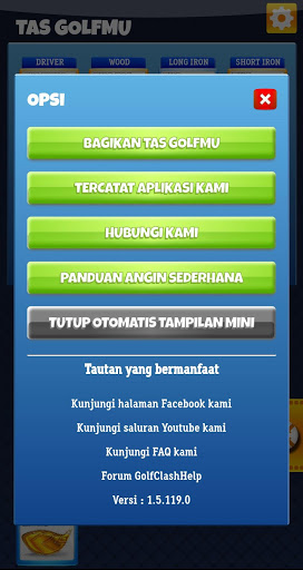 • Alat kalkulator angin; masukkan nilai angin pada kalkulator untuk mendapatkan dering angin untuk setiap klub, tersedia dalam mode sederhana dan mode lanjut (min / med / maks)