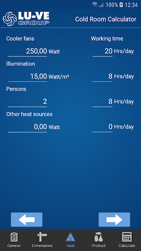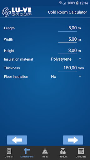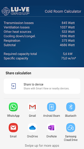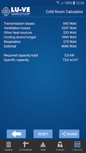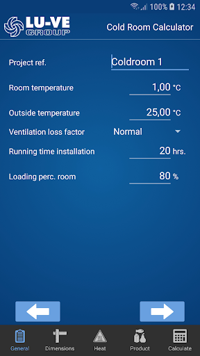 Masukkan data instalasi Anda di empat tab: Data suhu, dimensi ruang dingin, isolasi, kehilangan panas dan produk yang disimpan.Kemudian pilih Tab Hitung untuk langsung melihat perhitungan untuk instalasi Anda.Anda dapat mengirim data dan perhitungan dalam email untuk diri sendiri atau klien.