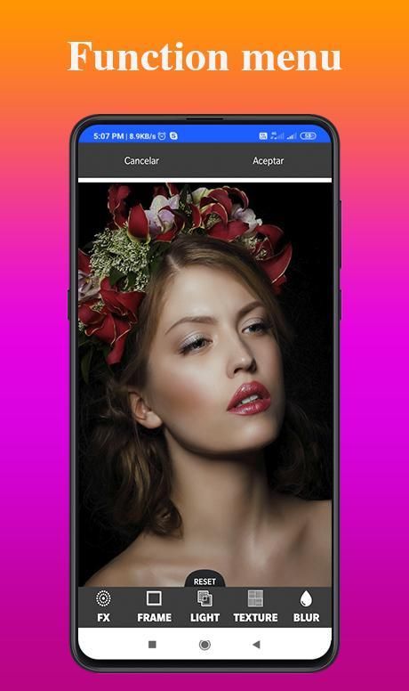 Grafis yang kaya dan antarmuka pengguna yang menarik. Antarmuka yang mudah digunakan. Ini adalah alat pengeditan foto.