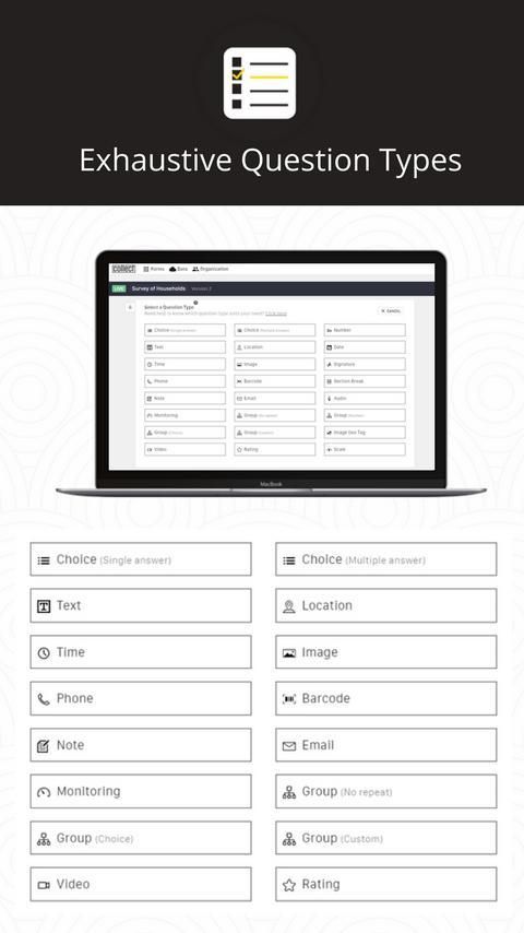 - Over 20 question types — images, audio, video, tabular, monitoring, map, geolocation, signature, barcode, date, time, phone number, email, dropdown, scale, and more.