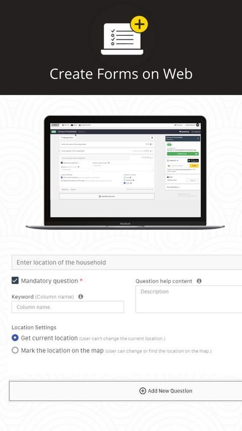 - Lebih dari 20 jenis pertanyaan - gambar, audio, video, tabel, pemantauan, peta, geolokasi, tanda tangan, barcode, tanggal, waktu, nomor telepon, email, dropdown, skala, dan banyak lagi.