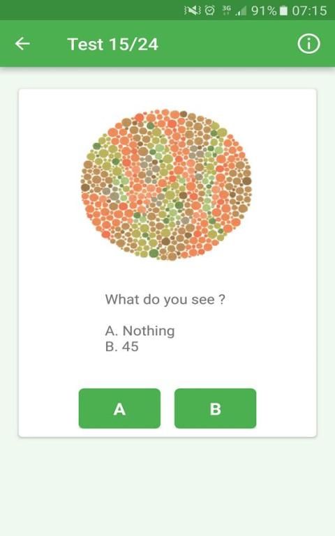 Warna Kebutaan Uji menawarkan Anda untuk membuat panjang versi Ishihara Color Uji dengan 24 piring. Selama pengujian, Anda akan harus melihat 24 piring dan menjawab pertanyaan-pertanyaan untuk mengatakan apa yang Anda lihat di layar. Pada akhir tes, berdasarkan jawaban Anda, Warna Kebutaan Uji bisa memberikan Anda hasil untuk Anda Ishihara Color Test. Dengan demikian, Anda bisa memiliki penglihatan normal warna, warna kebutaan total, seorang buta warna merah hijau, warna merah buta penglihatan (protanopia), warna merah ringan buta penglihatan (prontanomaly), warna hijau buta penglihatan (deuteranopia) atau masih warna hijau ringan tunanetra (deuteranomaly). Anda dapat menyimpan jejak tes sebelumnya melalui fitur History.