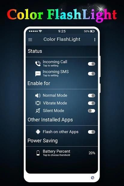 - color flashlight Notification Color app can be set to work in different phone modes.