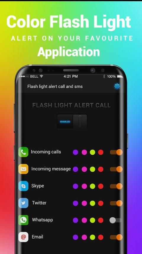 Dapatkan warna lampu kilat peringatan untuk memastikan tentang panggilan atau sms di ponsel Anda, dan dengan itu multicolor Flash peringatan on call dan sms dan notifikasi, Anda memilih warna untuk setiap kegiatan untuk mengetahui apa pemberitahuan masuk dalam ponsel Anda seperti saya telepon misalnya, sehingga Anda dapat menyesuaikan untuk setiap aplikasi Ini benar mewarnai dan berkedip waktu flash.