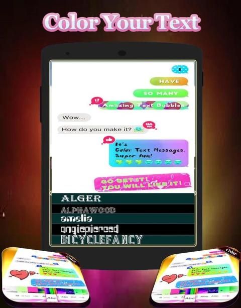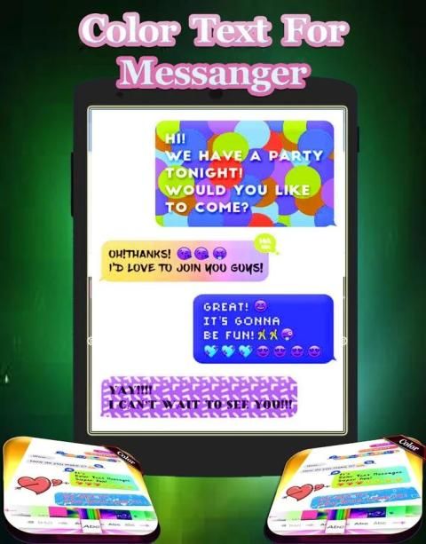 Nikmati Warna Texting & memiliki waktu yang baik dengan teman-teman! Hiburan & menyenangkan dijamin. Anda bahkan dapat menggunakannya untuk yang ingin & mengirim salam kartu ulang tahun, ulang tahun pernikahan, musim liburan dan terima kasih.