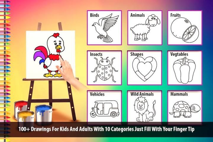 Kids Coloring Book game is designed for kids and adults to develop drawing and coloring skills. This Kids game contains many drawing and painting images to draw and learn coloring for kids and adults.It shows your kids imagination and creative skills. Its a fun learning app.