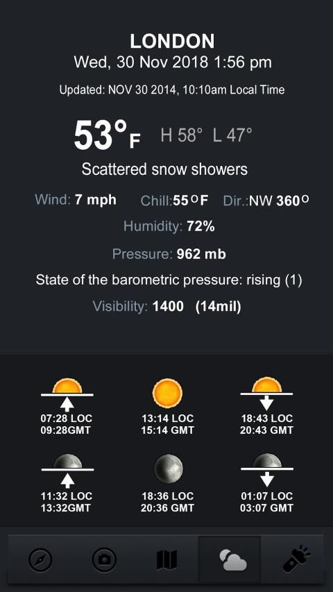 It shows sun and moon azimuth on the compass, just turn it on with the button. It is using astronomical algorithms to calculate the azimuth with your current location and date and time of a day.Also in weather tab you can find more info about sun and moon.