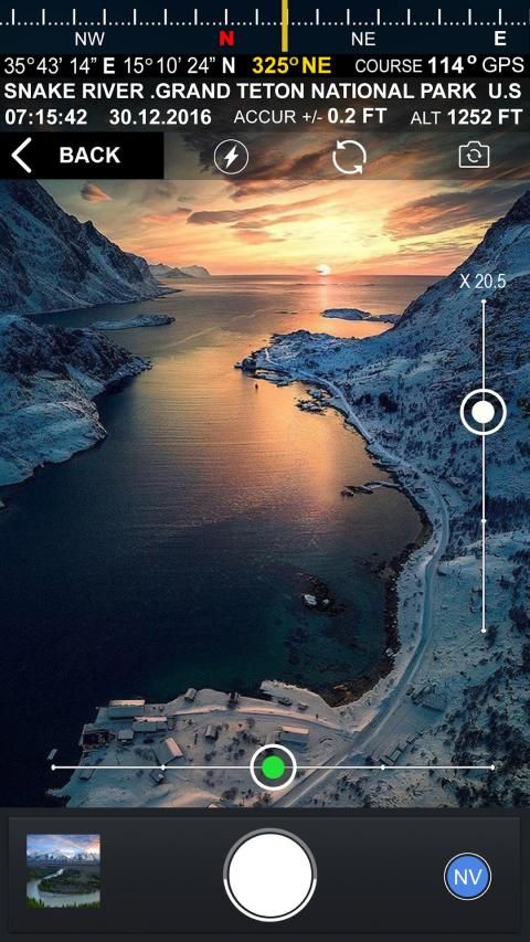 Kamera foto dengan peningkatan mode malam dan 30x zoom. Nama dan informasi lengkap tentang lokasi akan ditempatkan pada foto yang diambil.