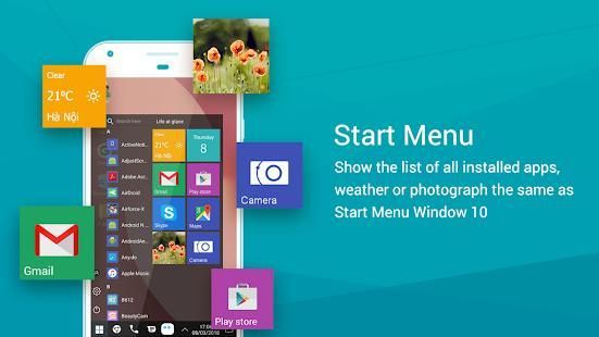 Windows Launcher toolbar dirancang seperti taskbar pada Windows 10 dengan fitur seperti aplikasi yang terbuka, buka aplikasi yang baru saja dibuka, pemberitahuan, tampilan kalender dan fungsi perangkat menjadi milik Anda.