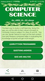 Computer Science : This app covers the new syllabus for Class XI and XII of CBSE. The 'Speak' feature of the App reads the text contents on just a click. Short Questions and Answers are framed in lucid manner. The Quiz component of the app evaluates the knowledge acquired by a student. and helps the analyzing their performance so they could get more insight.