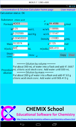 CHEMIX School concentration calculator and dilution calculator offer an easy and intuitive way of calculating and convert between different unit concentrations. It allow dilution calculations using a stock solution.