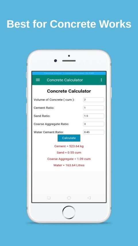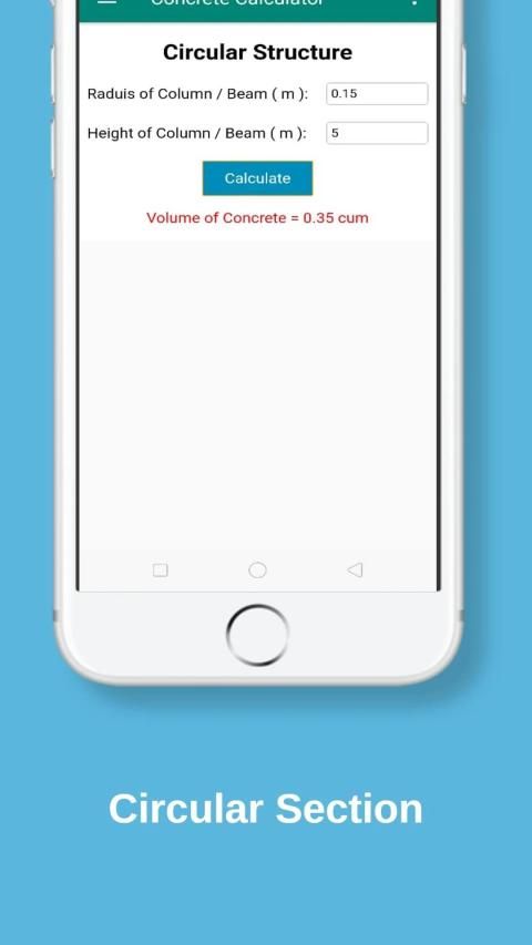 Concrete Calculator calculates the quantity of cement, sand and aggregate for construction works, also determine the water quantity for the work, It also do volume calculation of circular (column or beam) and rectangular (column, beam , slab) section. The application does not requires Internet and it is free to use for any purpose.