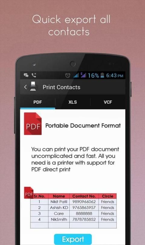 Aplikasi ini memberikan Anda fasilitas untuk menyimpan kontak Anda dalam format .Pdf, .xls, .vcf, tidak perlu menyimpan kontak Anda lagi & lagi di app juga, aplikasi akan menyelaraskan secara otomatis daftar kontak ponsel Anda setiap kali.