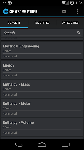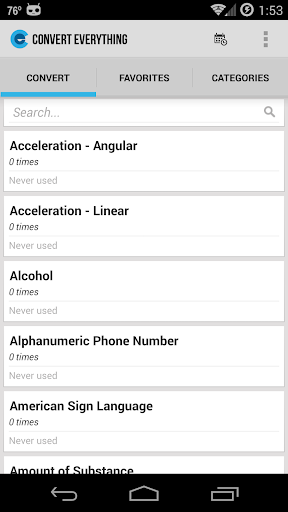 Convert Everything is a unit converter and calculator but also much more. In fact, there are so many conversions and calculators in this app that I cannot fit them inside the description. You can easily organize your favorite conversions for easy sorting. Additionally, you can also view your past unit conversions via the history menu.