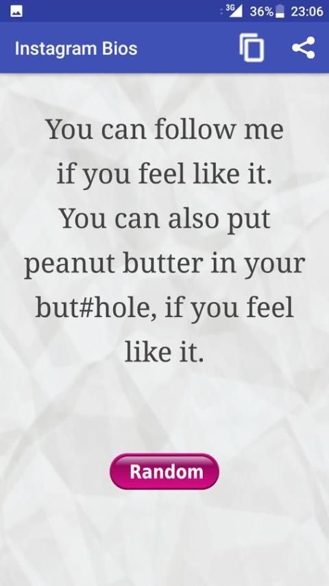 Cukup klik tombol acak dan terus mengeksplorasi bios keren yang dapat Anda membuat Anda sendiri. Sekarang, tidak perlu mencari atau meregangkan sel abu-abu Anda untuk menciptakan yang bio mengesankan untuk profil Anda. Hanya menemukan bahwa dalam aplikasi cahaya ini.