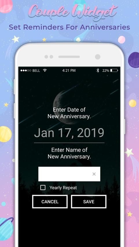 Couple Widget memungkinkan Anda mengetahui hari jadi yang penting secara terus-menerus jika pengguna memasukkan informasi pasangan secara sederhana.