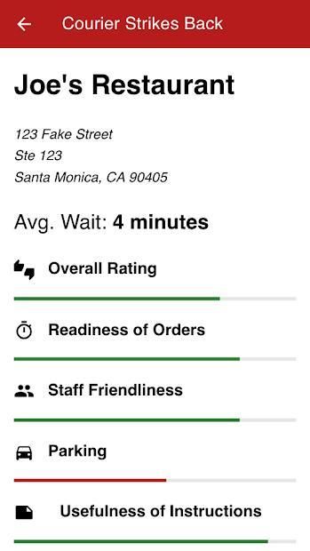 Before accepting an offer to pick up an order, use Courier Strikes Back to look up the profile of the restaurant. If other couriers have reviewed the same restaurant, you'll have access to facts such as the overall positivity rating, the average wait time, the quality of parking, and more. Using this information can help you decide if you can squeeze in another offer from a separate app , have time to do wait or do other things like get gas, or simply not take the offer and wait for a better one.