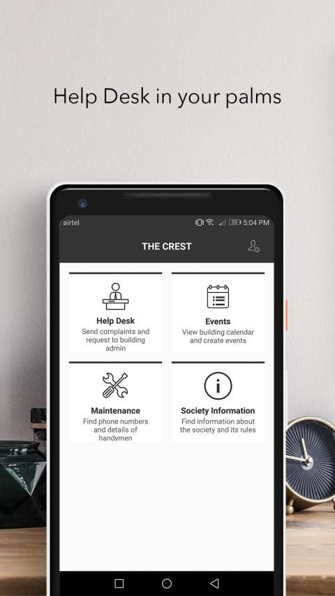 Experience the hassle-free life with our Crest Home Services App. No need to go around to find and contact Crest Personnel for complaints or requests - Help Desk in your palms. Send and get all your complaints and requests addressed from the App. Get access to the phone numbers and details of the Maintenance staff and Handymen. View Society Activities on the Events Calendar. For all the requests and complaints lodged, the related staff will get back to you and resolve the request at priority.