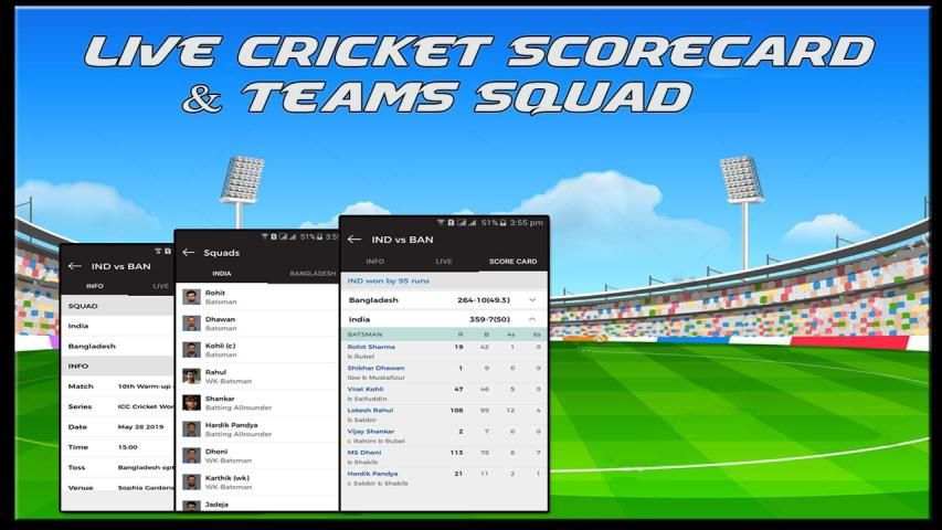 Aplikasi ini mencakup semua perlengkapan internasional dan perlengkapan domestik dalam semua format - T20, Tes dan ODI juga. App juga mengikuti turnamen kriket wanita Anda juga dapat menikmati pertandingan kriket langsung dari mereka.