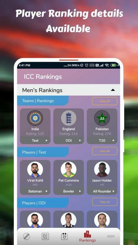 All-League, Women, ODI, T20, Test match International tercakup dalam CricLine.