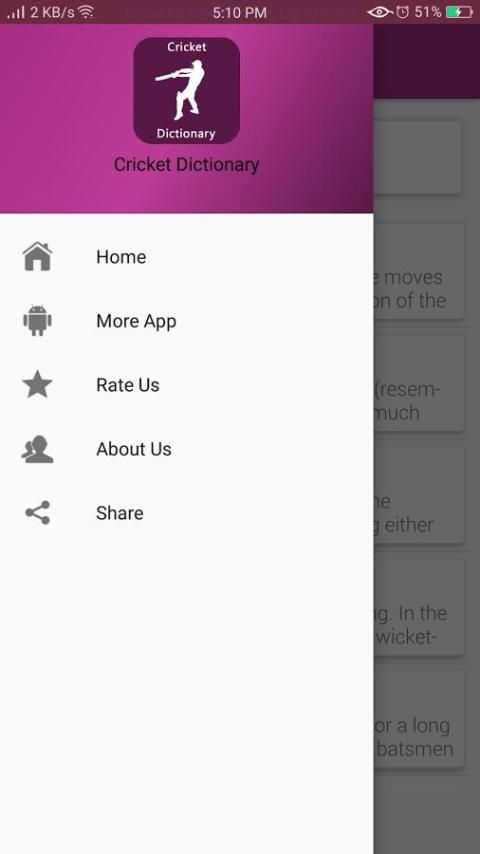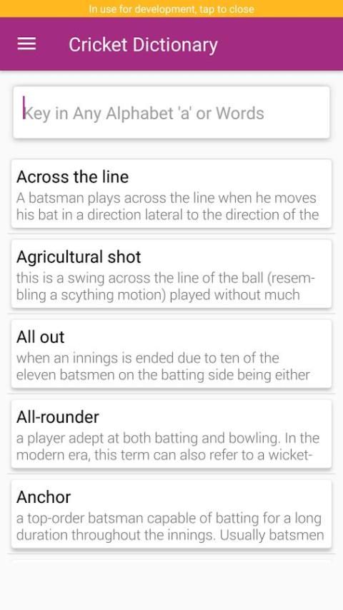 terminologi. Aplikasi ini membantu Anda untuk memahami semua istilah yang terkait dengan kriket. Aplikasi ini sangat membantu untuk pecinta kriket dan orang-orang yang ingin tahu tentang kriket.