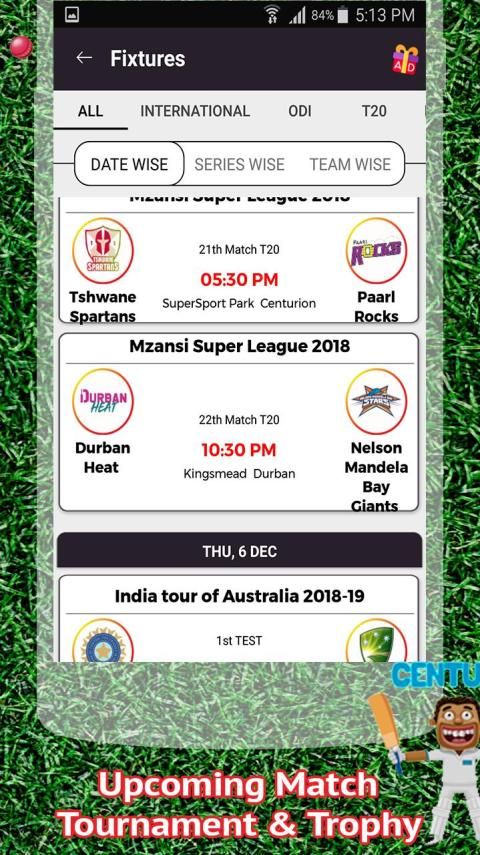 app provides ball-by-ball coverage of all international cricket matches (Test, ODI and T20),