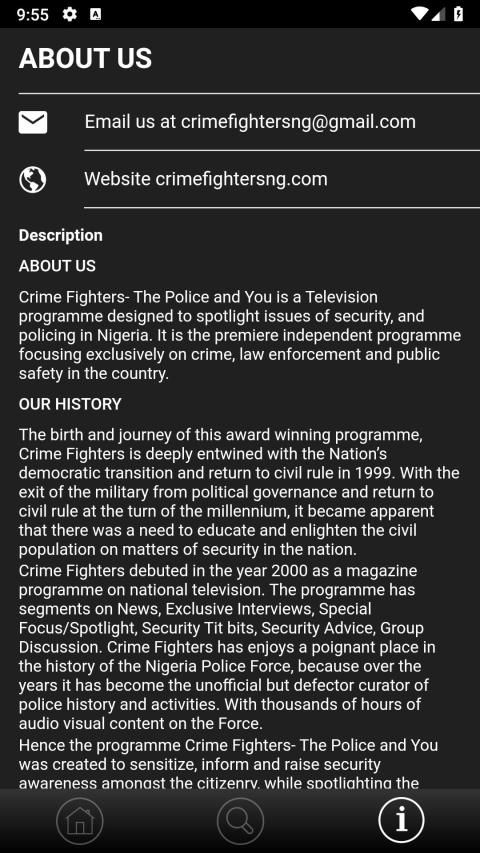 Crime Fighters debuted in the year 2000 as a magazine programme on national television. The programme has segments on News, Exclusive Interviews, Special Focus/Spotlight, Security Tit bits, Security Advice, Group Discussion. Crime Fighters has enjoys a poignant place in the history of the Nigeria Police Force, because over the years it has become the unofficial but defector curator of police history and activities. With thousands of hours of audio visual content on the Force.