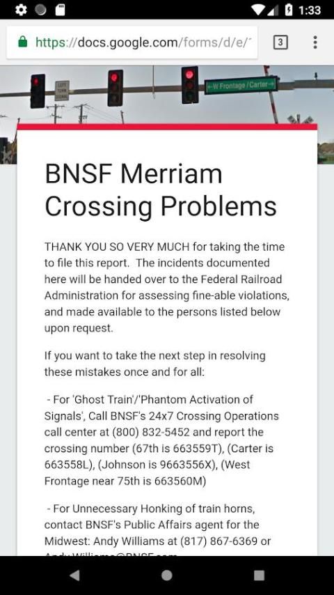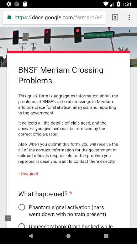 Aplikasi ini memberikan Anda cepat pintas untuk CrossingMerriam.org untuk melaporkan masalah persimpangan rel-jalan di salah satu dari empat BNSF penyeberangan rel-jalan di Merriam KS. Ini akan menanyakan rincian penting, dan membuat informasi yang tersedia kepada pihak yang berwenang. Selain itu Anda akan menerima informasi kontak langsung untuk otoritas yang bertanggung jawab langsung, jika Anda ingin menghubungi mereka secara langsung. Anda juga dapat meninjau hasil dikumpulkan pada http://Results.CrossingMerriam.org
