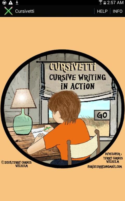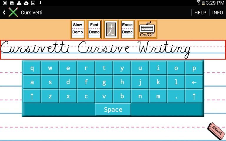 Using the keyboard, alphabetic letters are entered into the demo writing area where they appear as cursive writing. This cursive writing can be animated with the click of a button. Upon clicking the template button, the cursive writing appears in the practice area as a tracing template. Handwriting entered on the template (with either finger tracing or a stylus) stays visible after the template is turned off. The user can also practice writing without the template. Good for home and school.