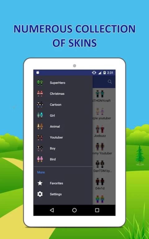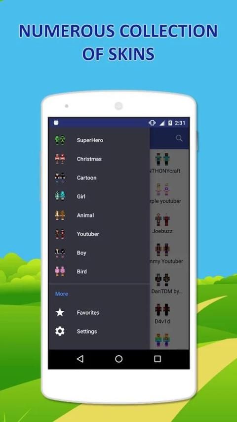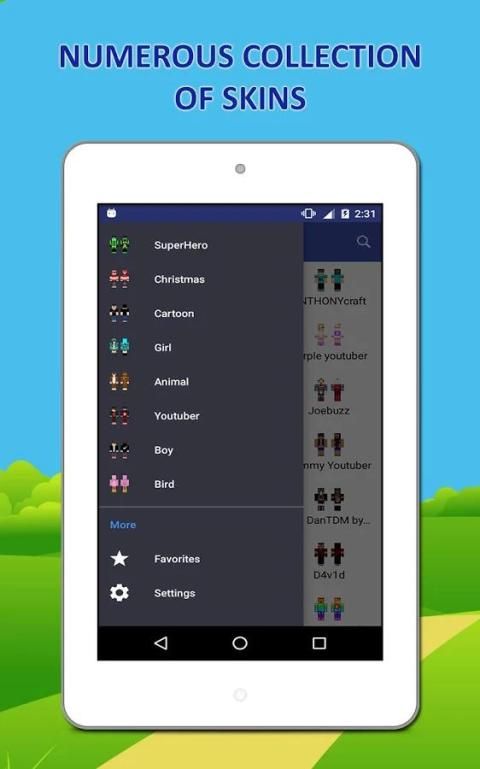 "Custom Skins - Exclusive Collection dari Minecraft Skins" meliputi Gadis Skins, Boy Skins, Animal, SuperHero, YouTuber, Kartun, Natal, Bird dll