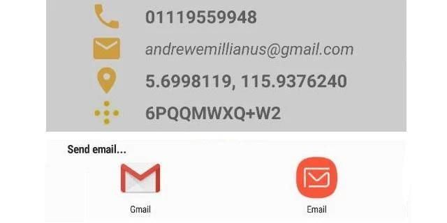 - Hubungi Kami: kontak melalui telepon atau email, ketika Anda menyentuh ikon telepon itu akan mengaktifkan panggilan telepon. aktivasi yang sama terjadi pada icon email.