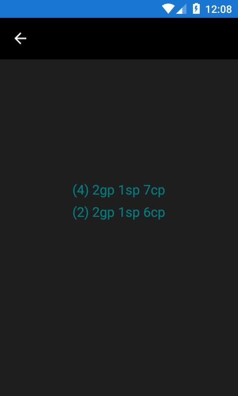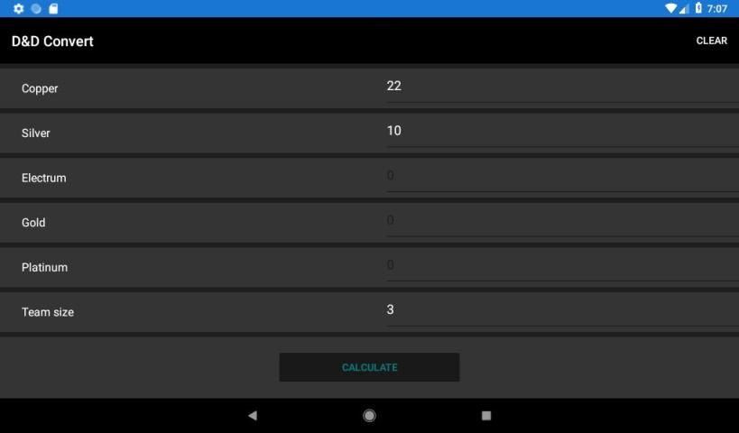 Splitting coins among team members after a fight or other event can be time-consuming and confusing. Even more so if the coins don't distribute evenly among the party. Enter the total currency and the number of party members and this app will take care of it.