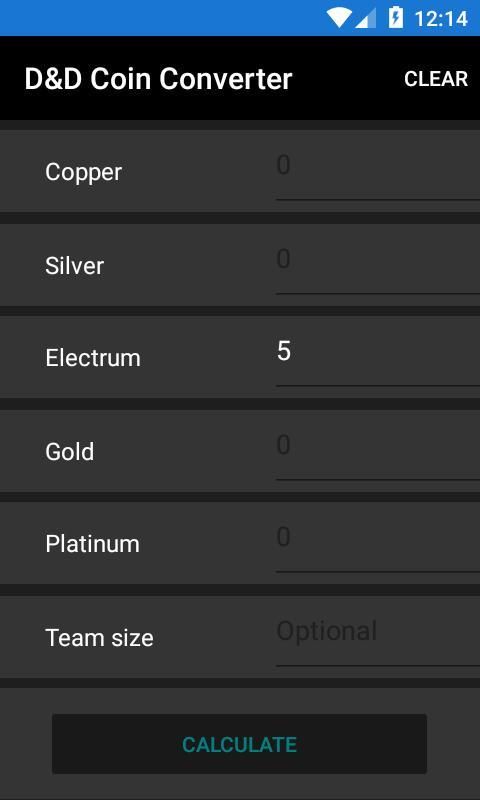 Sebagian besar pemain Dungeons and Dragons menghindari koin electrum dan platinum karena dapat membingungkan. Masukkan jumlah platinum, emas, elektrum, perak, atau tembaga dan itu akan dikonversi menjadi emas, perak, dan tembaga yang setara.