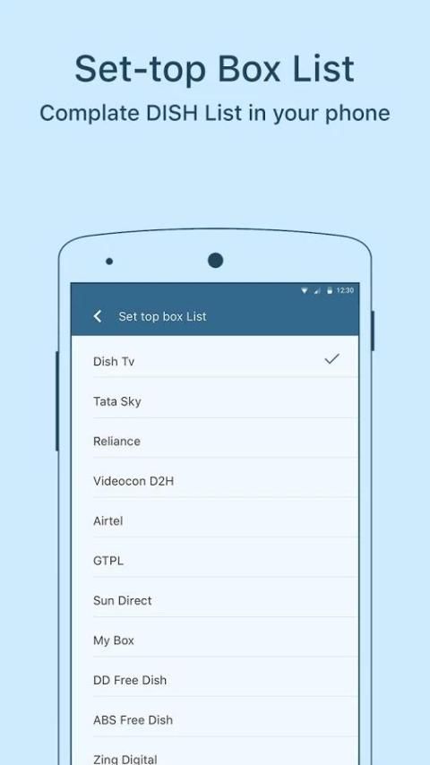 DISH / DTH TV REMOTE-UNIVERSAL akan membantu Anda untuk mengoperasikan koneksi DTH Anda di TV. Universal set top box remote control, salah satu aplikasi terbaik yang membantu Anda untuk mengubah ponsel pintar android Anda untuk remote untuk TV Anda.