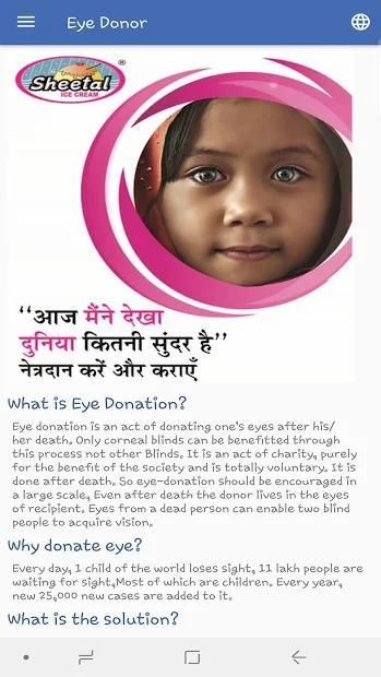 Pengguna juga dapat memperoleh pengetahuan tentang donasi Mata dan juga dengan bantuan Aplikasi ini pengguna dapat menghubungi pusat bantuan sumbangan mata, pengguna juga dapat membantu pertahanan India kami dengan menyumbang online untuk perampok kami.