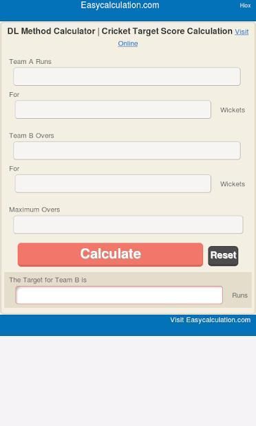 Cara DL Cricket Sasaran Skor Kalkulator: Untuk menentukan target skor untuk tim yang memukul kedua.