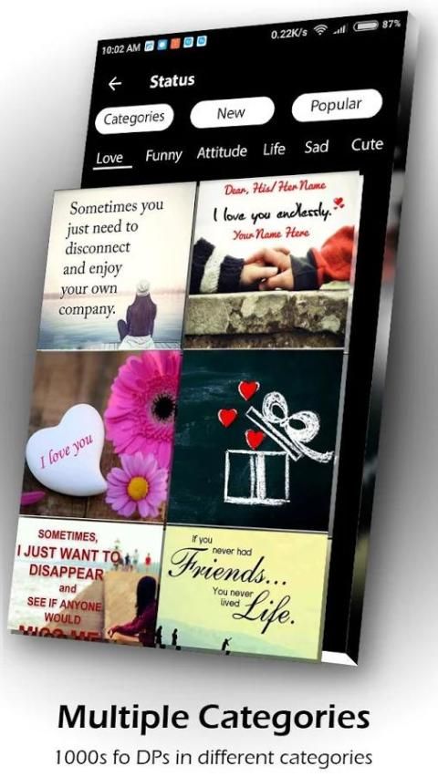 DP dan aplikasi Status Mengandung Semua Kategori Gambar seperti Romantis, Cinta, Pernikahan, Pacar, Sad Dp dan Status, Breakup, Gujarati dp dan Status, dan banyak lagi ..